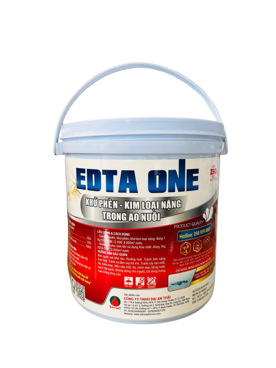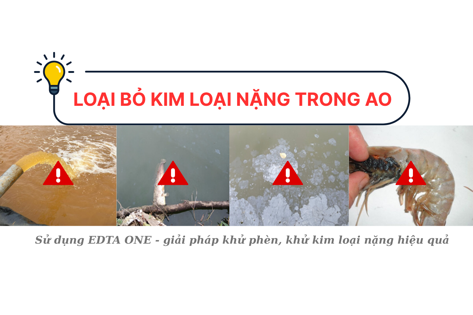 Sử dụng EDTA ONE: Các kim loại nặng như chì (Pb), thủy ngân (Hg), sắt (Fe), nhôm (Al)... thường hiện diện trong môi trường gần khu công nghiệp và khu dân cư, hay dùng nước khoan làm tôm bị nhiễm độc và không phát triển được. Những vùng đất bị nhiễm phèn thường có dư lượng Fe trong nước cao, trên 1 mg/l dùng với CaO với liều 200 - 400 kg/ha để hấp thu hết Fe trước thi thả tôm.